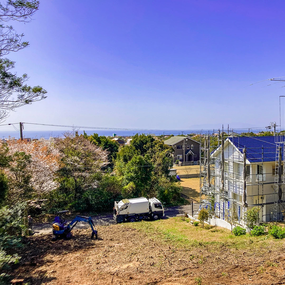 下り傾斜地に建っており、遮るものなく広がる緑の景色と水平線のパノラマビューが魅力です。