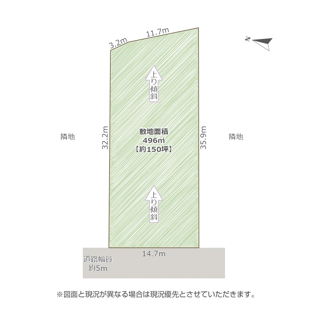 敷地は下り傾斜地となっており、現状は木々が生い茂っていますが、伐採すれば開放的になり、活用の幅も広がります。