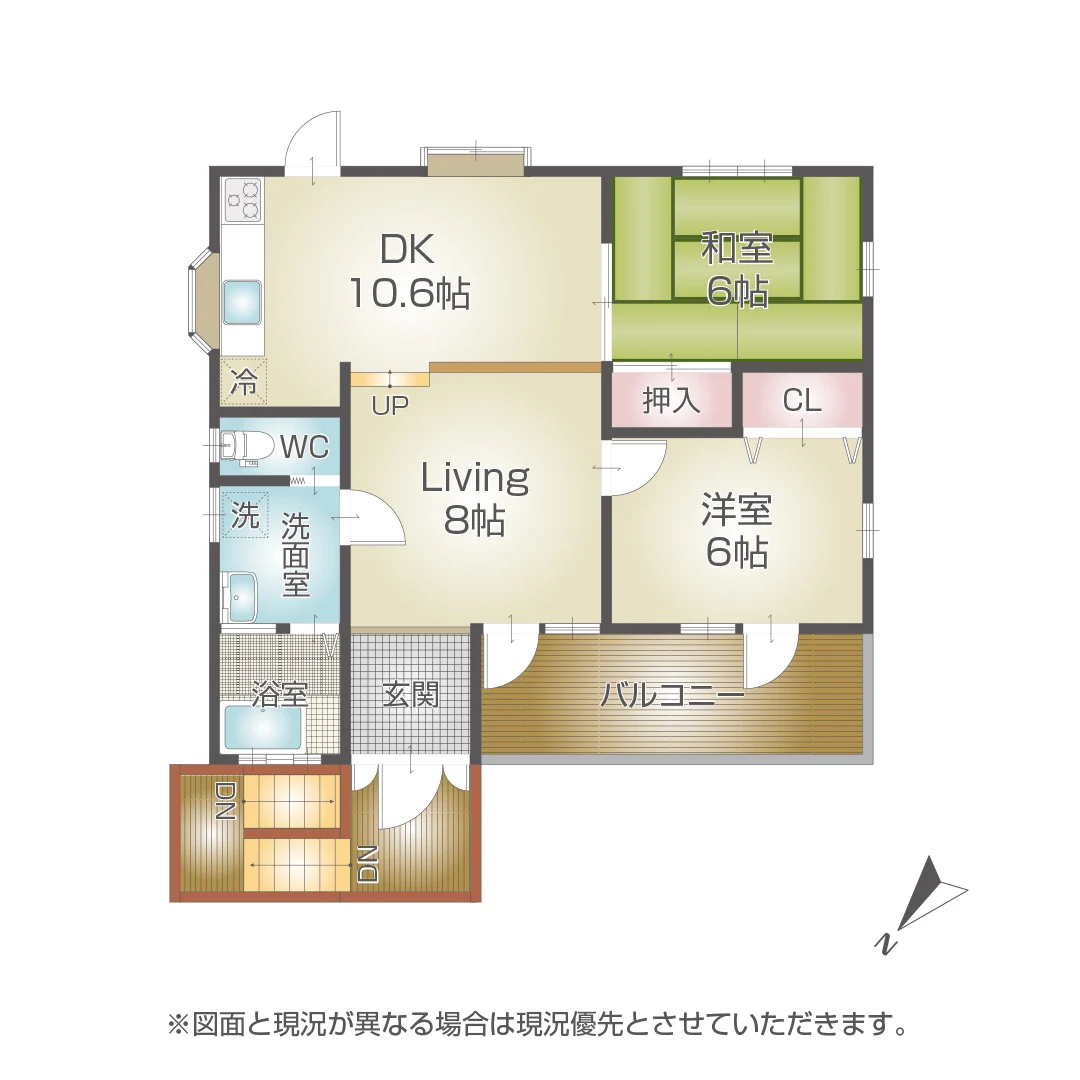 2階には約10.7帖のLDKと洋室が2部屋あり、家族でのびのびと過ごせる間取りとなっています。