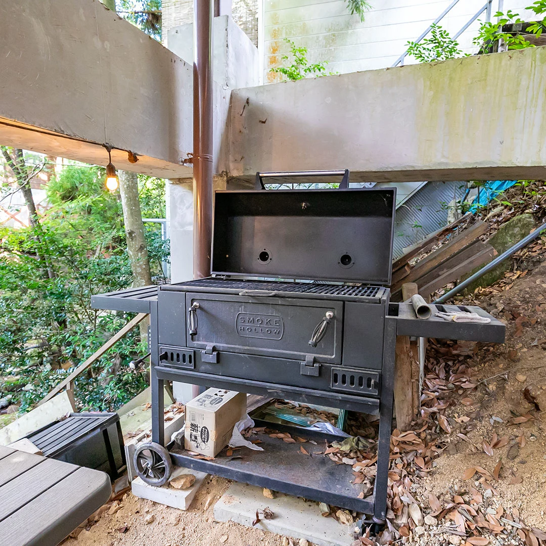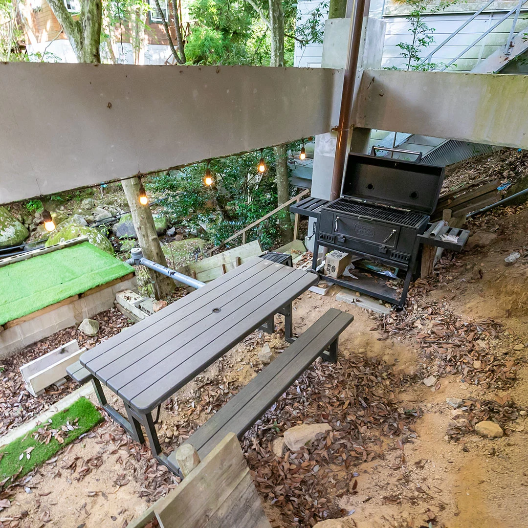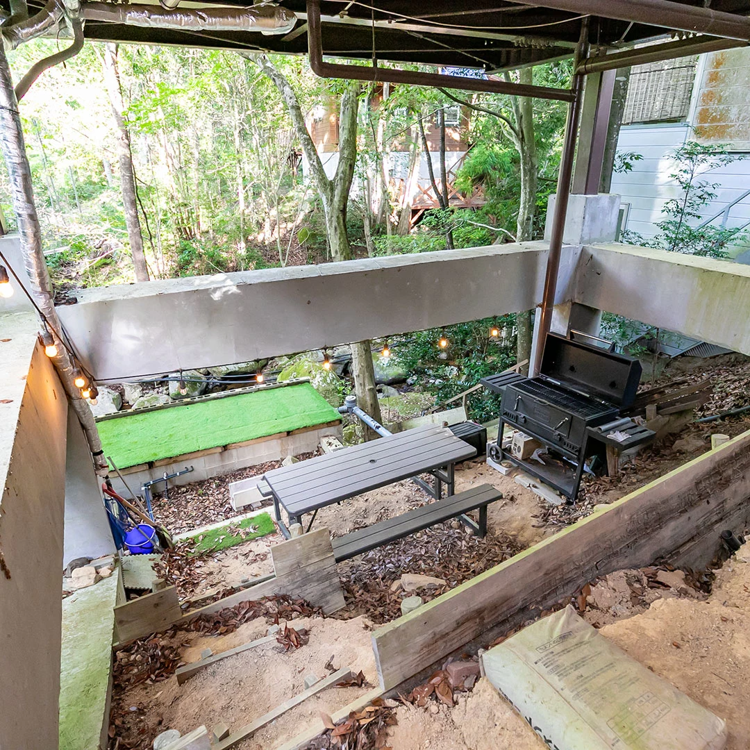 京都府南丹市の美しいるり渓に位置する流に面したログハウスは、2階建ての1LDKで下り傾斜に建てられており、建物下のスペースではバーベキューを楽しむことができます。
