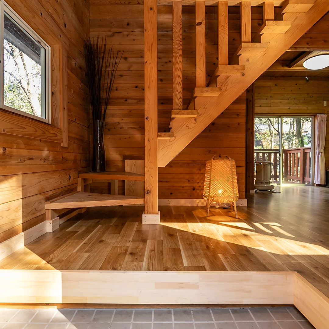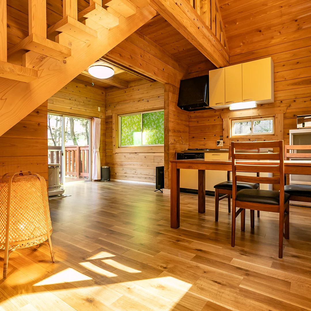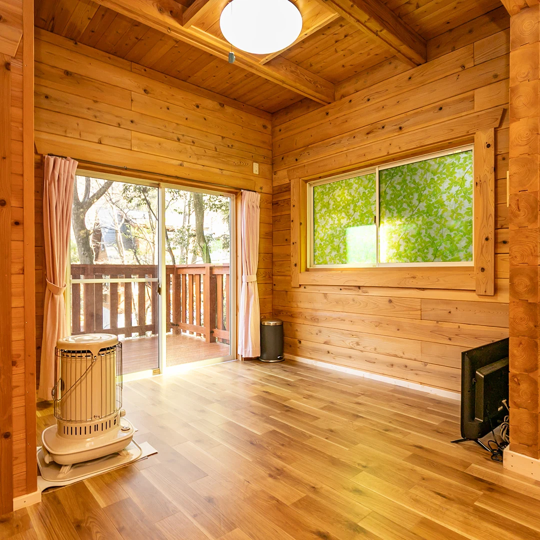 ログハウスならではの木材をふんだんに使用した室内は、落ち着きのある居心地の良い空間となっています。
