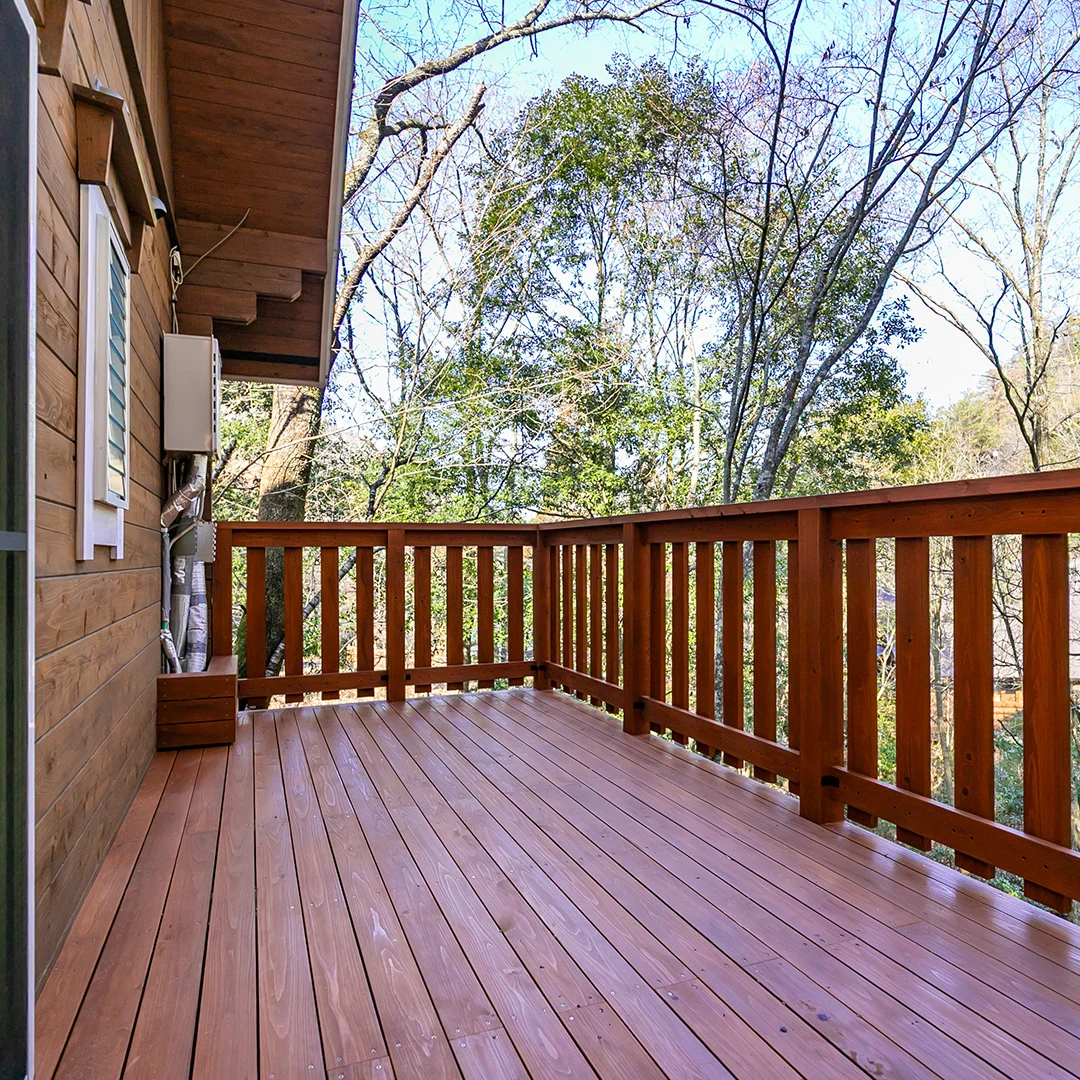 1階には広々とした11帖のLDKがあり、家族や友人とゆったりと過ごすのに最適で、ウッドデッキにつながる大きな窓からは緑の美しい景色を楽しむことができます。