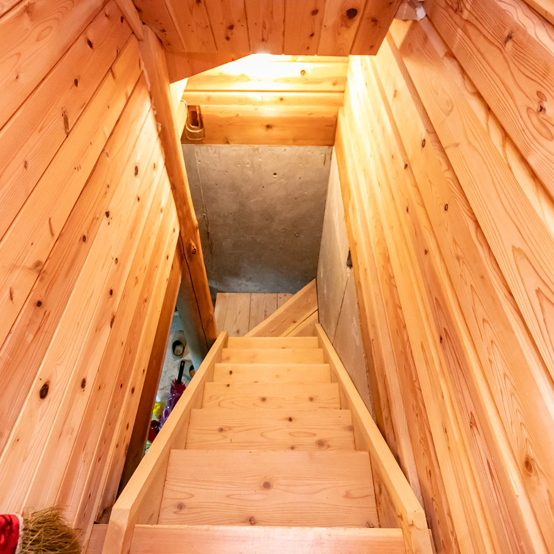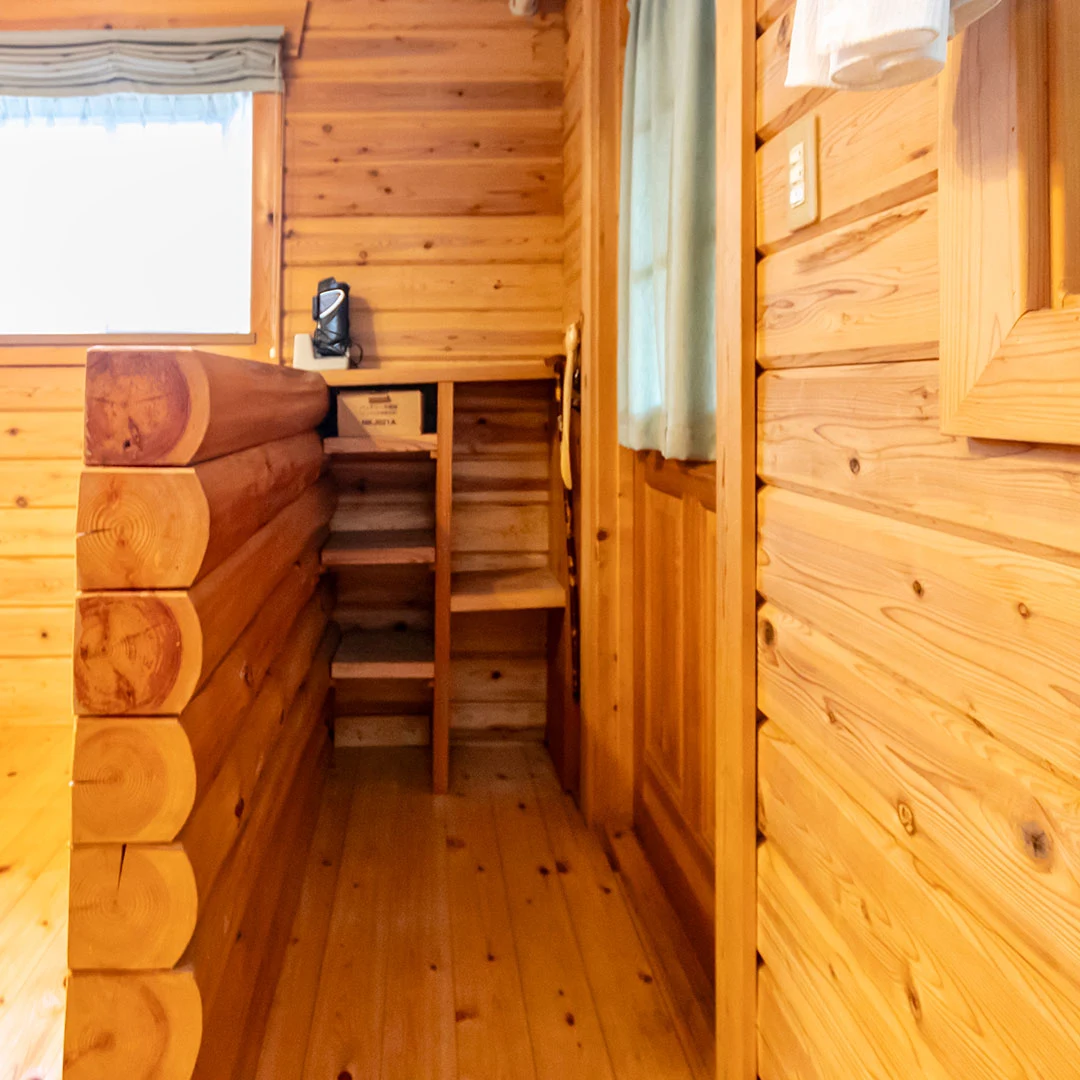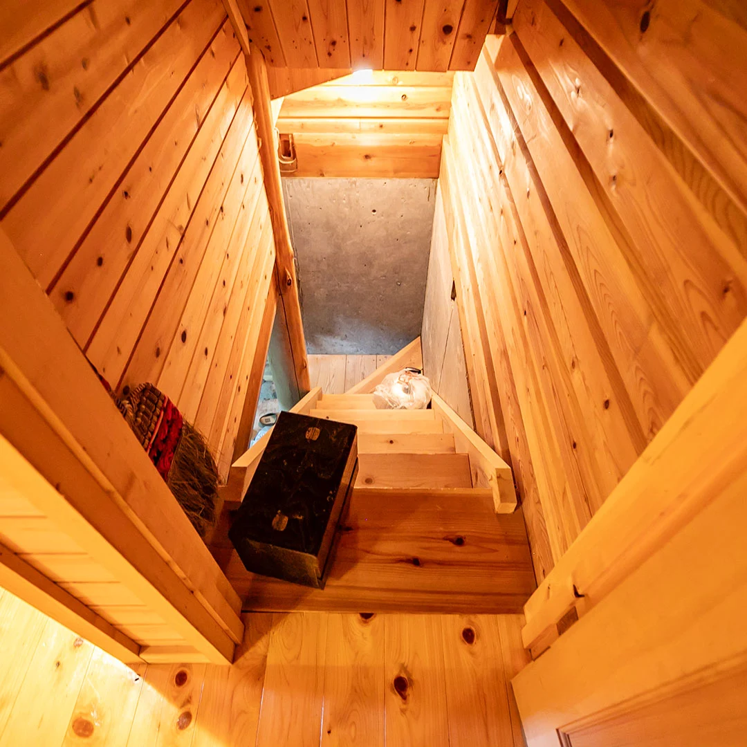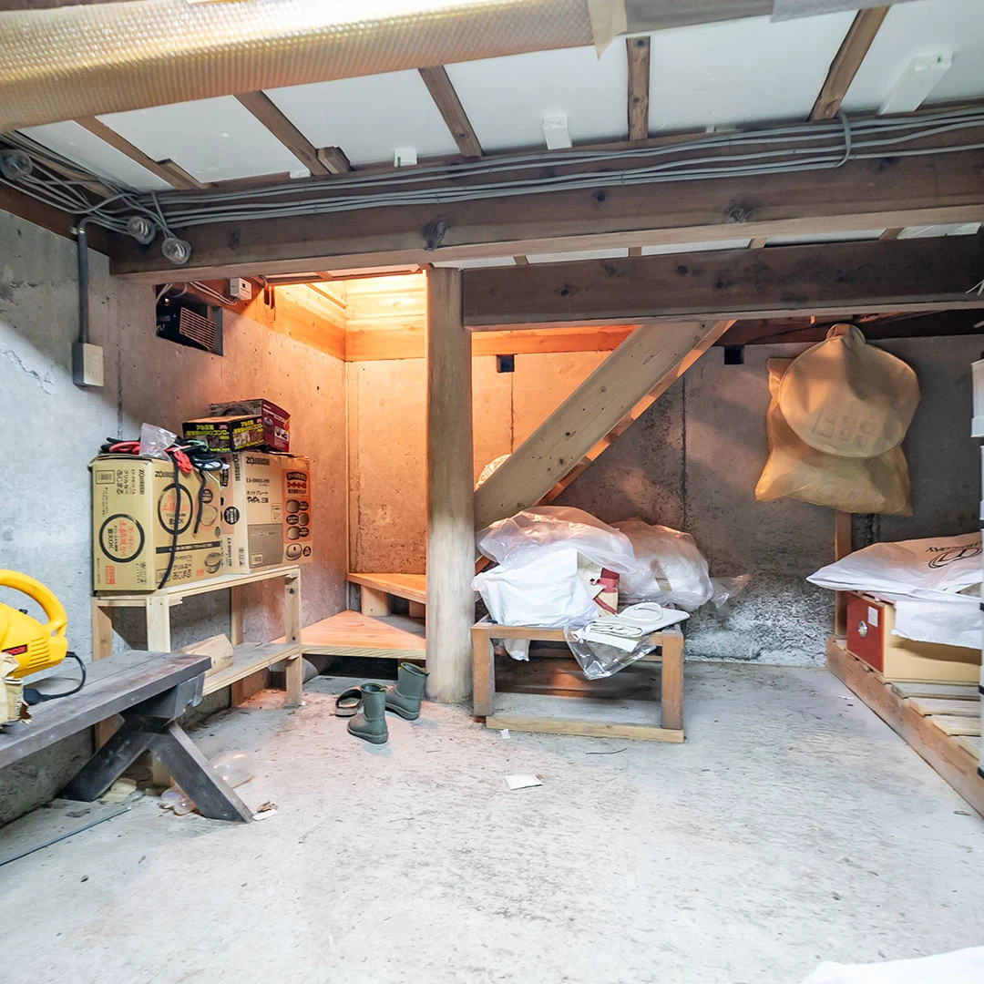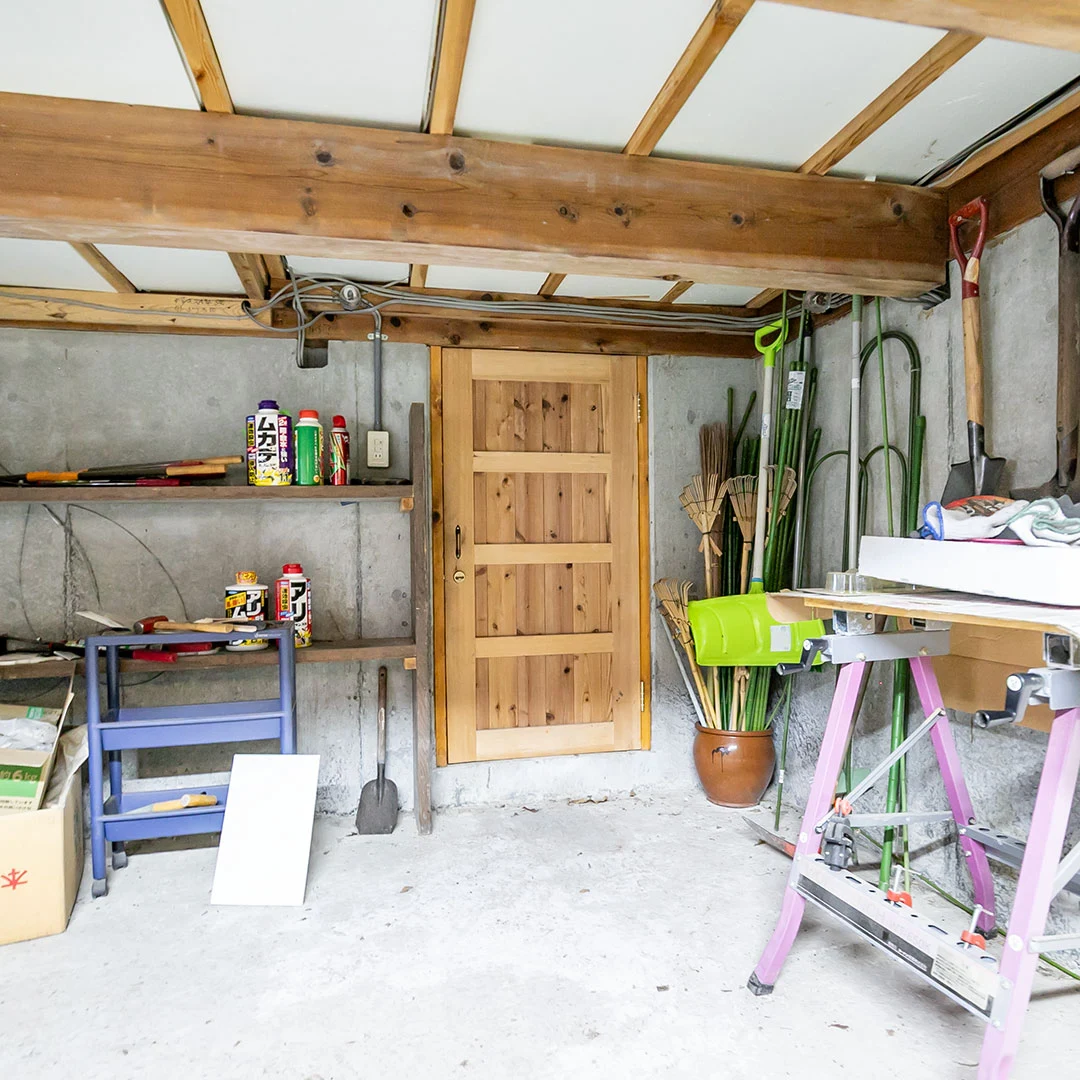 鉄骨基礎内は広い倉庫スペースとなっており、アウトドア用品や薪の保管などにも便利です。