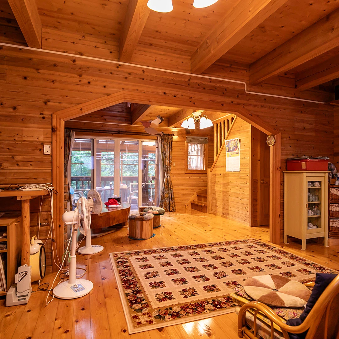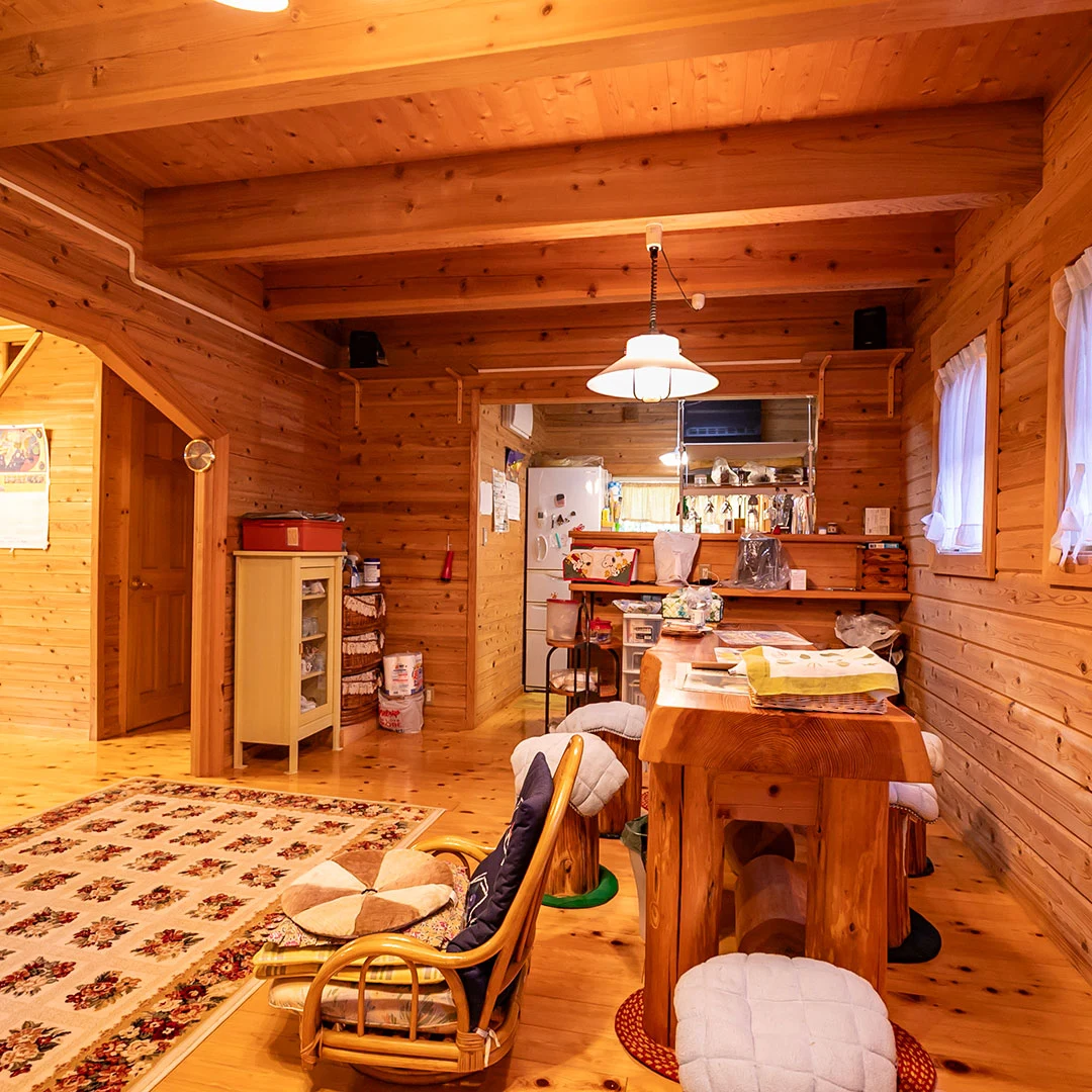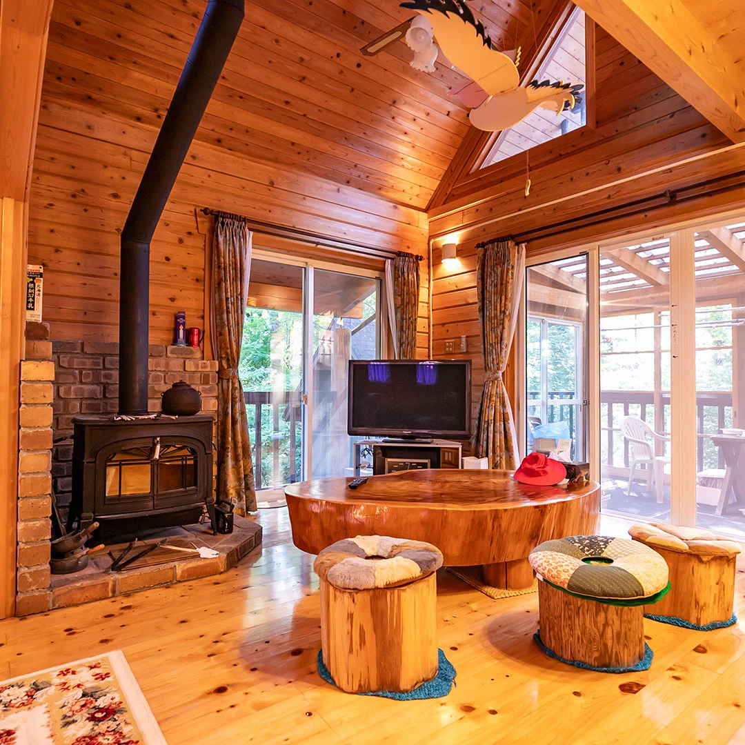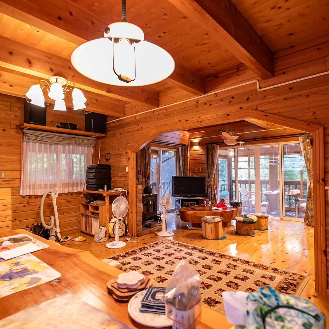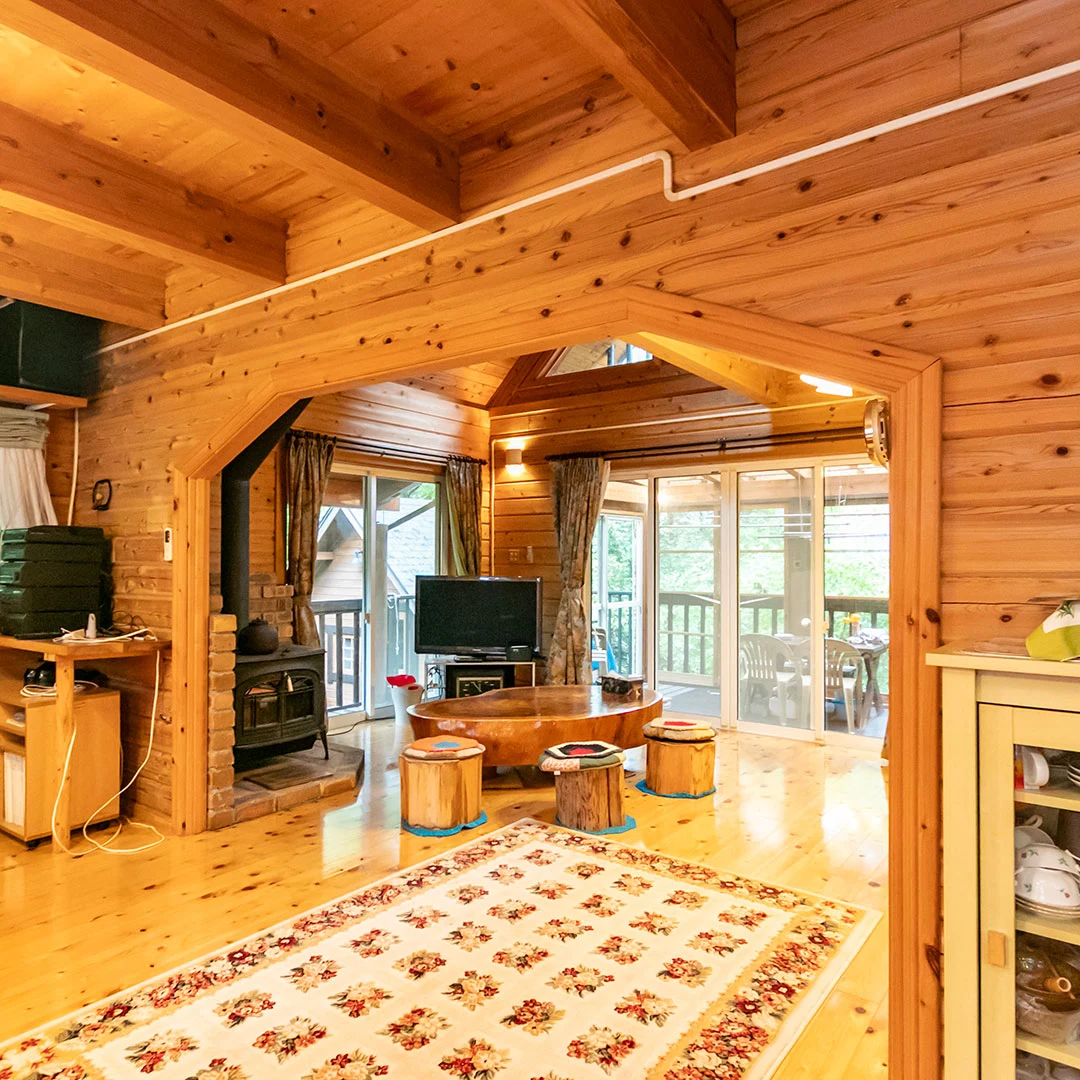 建物は木の温もりあふれる2階建てのログハウス。延床約95㎡の2LDKで、開放感のある21帖のLDKには薪ストーブを設置。