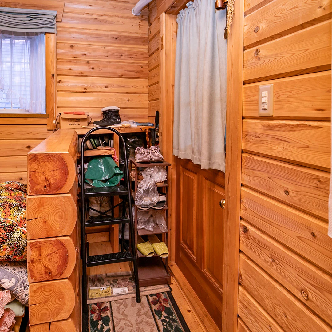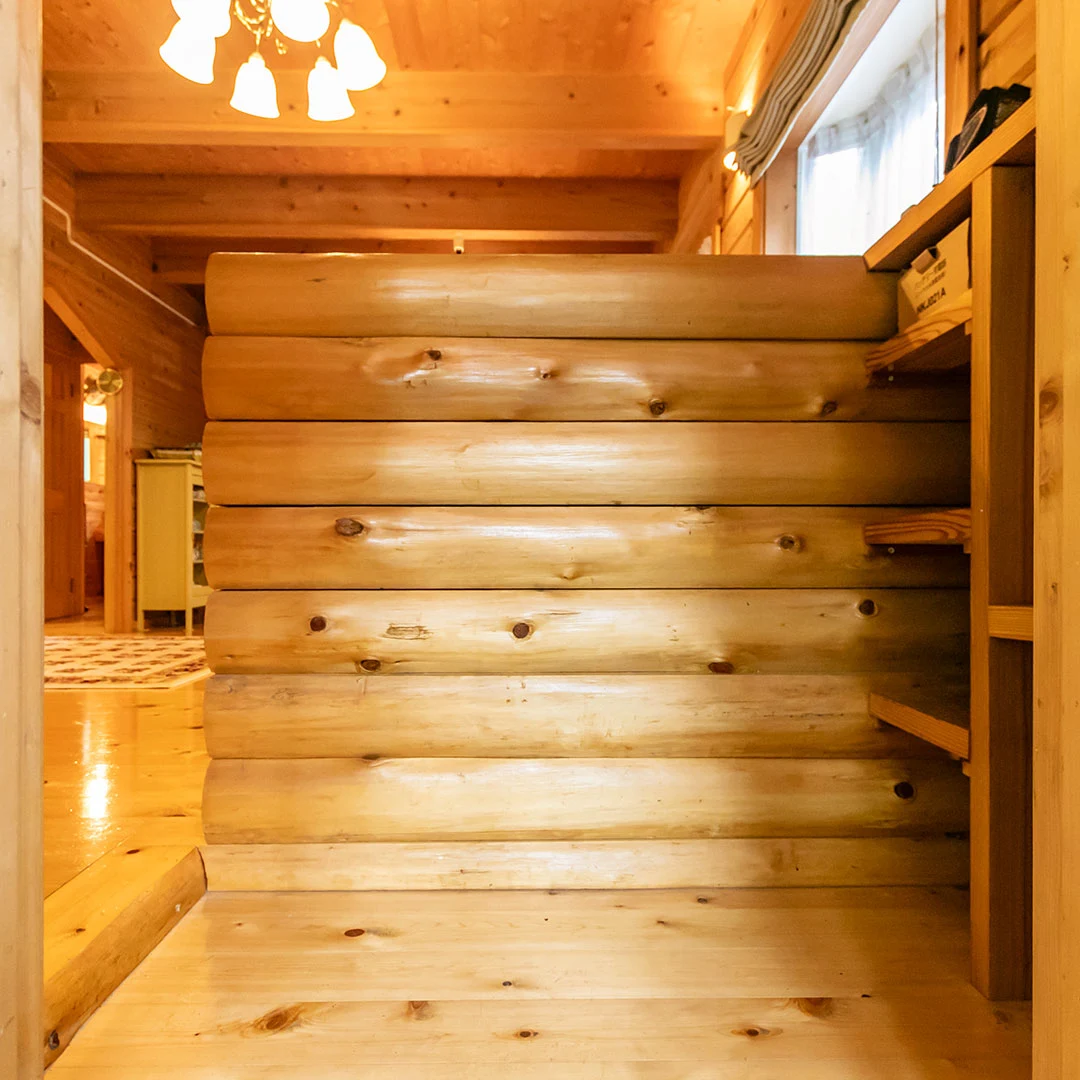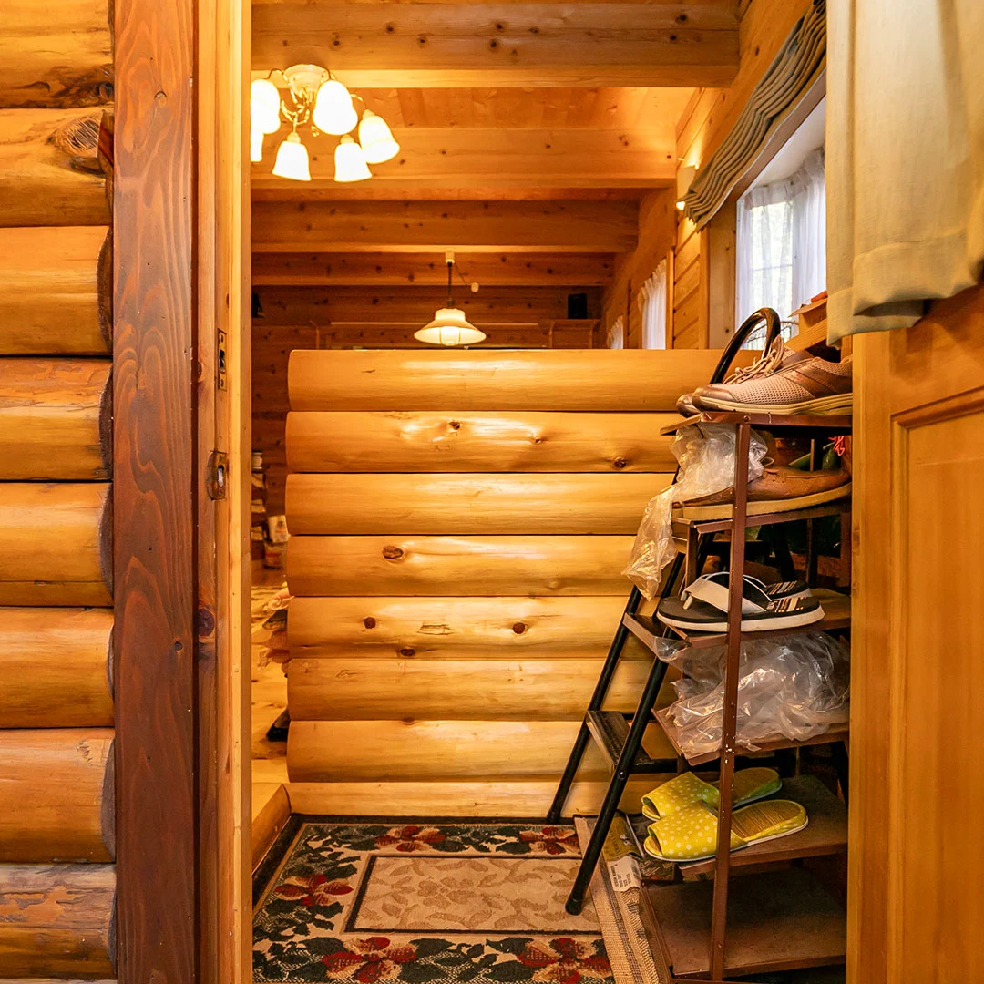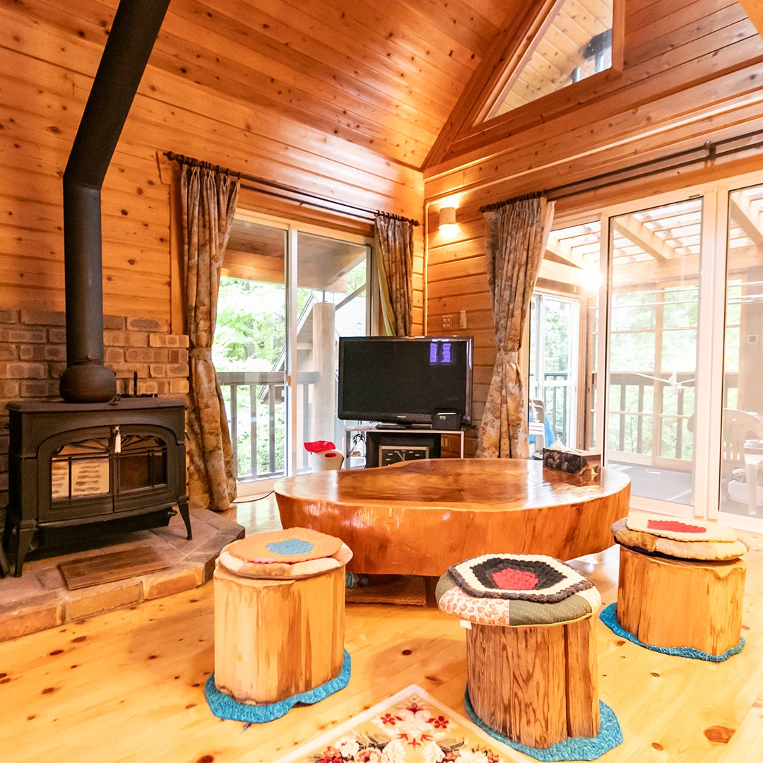 建物は木の温もりあふれる2階建てのログハウス。延床約95㎡の2LDKで、開放感のある21帖のLDKには薪ストーブを設置。
