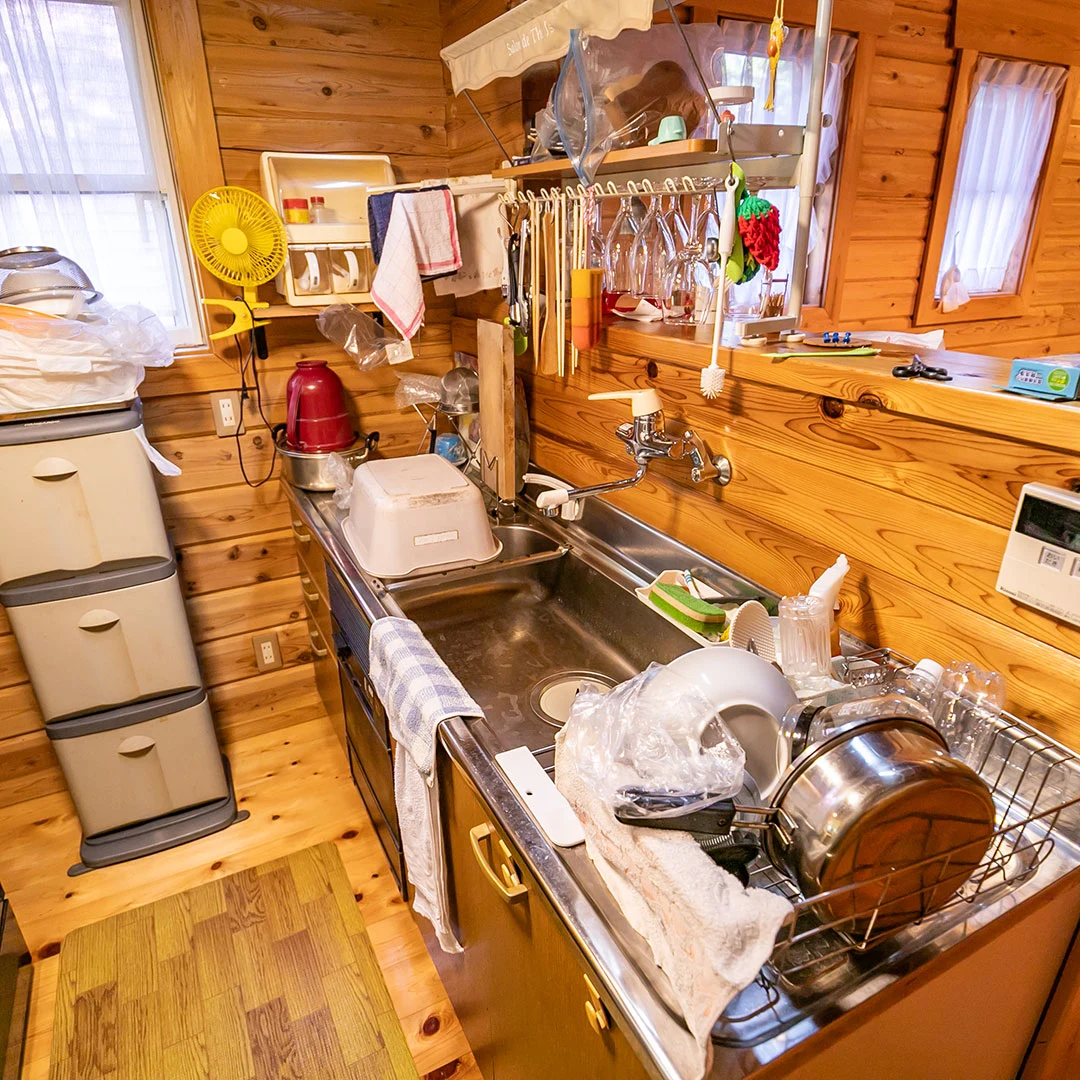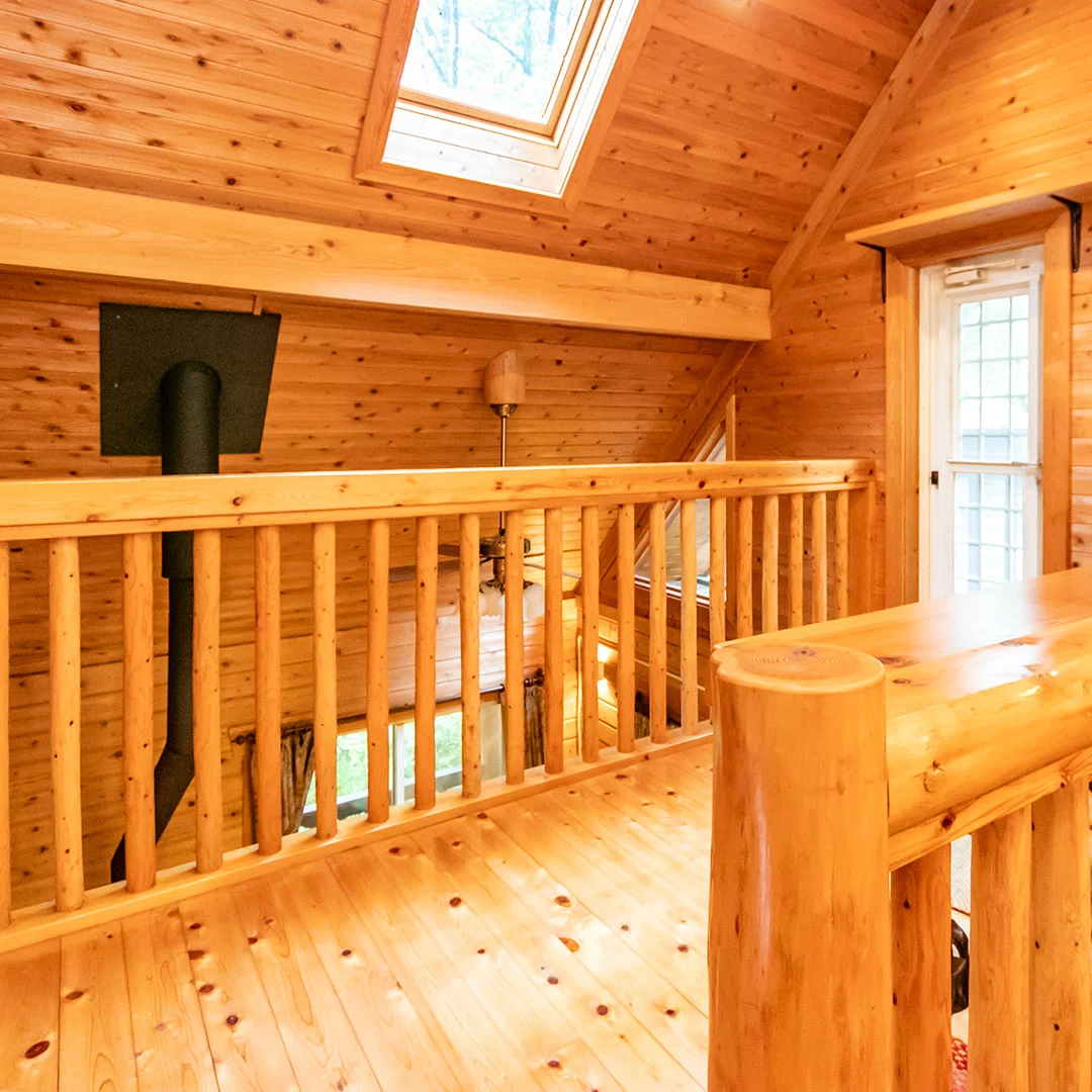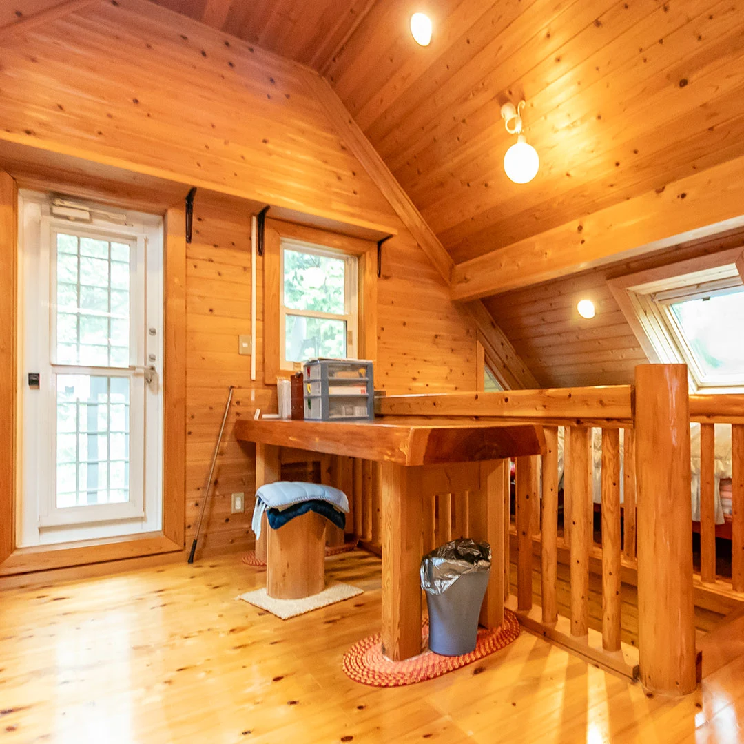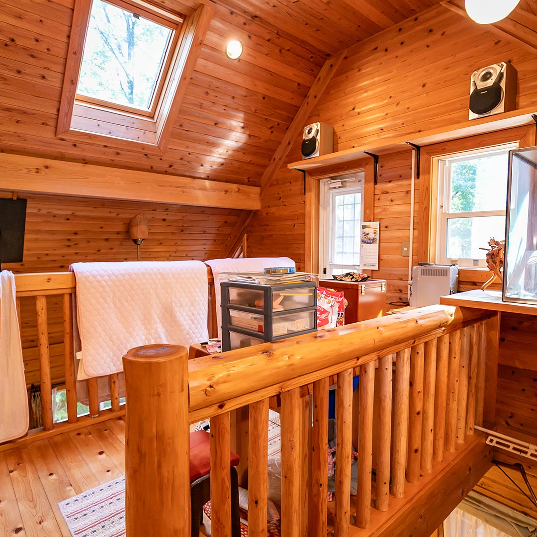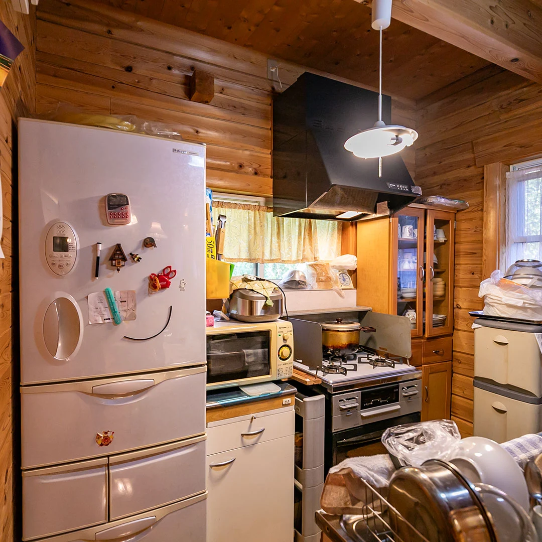 建物は木の温もりあふれる2階建てのログハウス。延床約95㎡の2LDKで、開放感のある21帖のLDKには薪ストーブを設置。