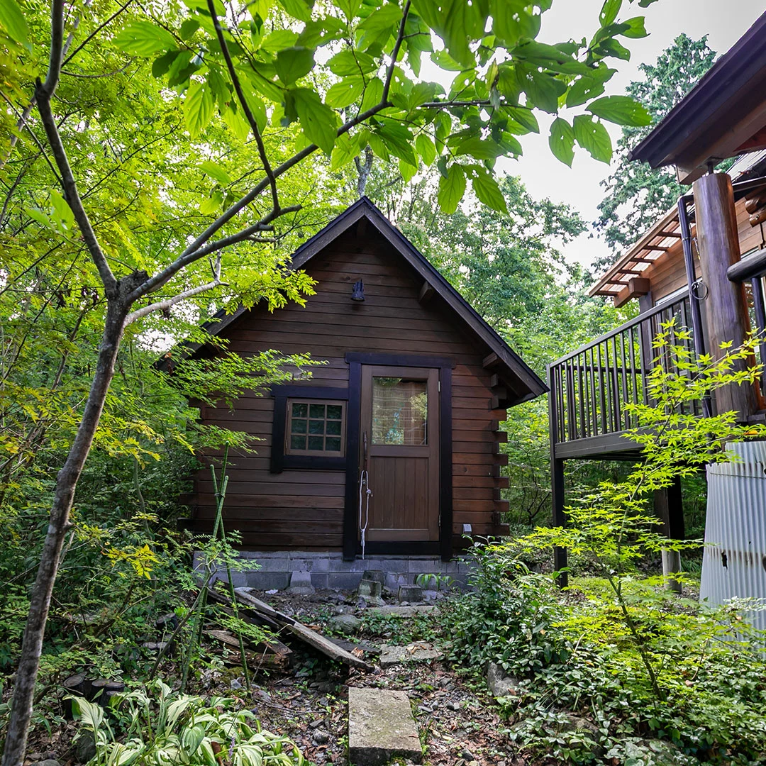 敷地はゆとりの101坪。庭には、囲炉裏を備えた趣あるログ小屋もあります。仲間と火を囲みながら語らうひとときは、まさに非日常の贅沢です。