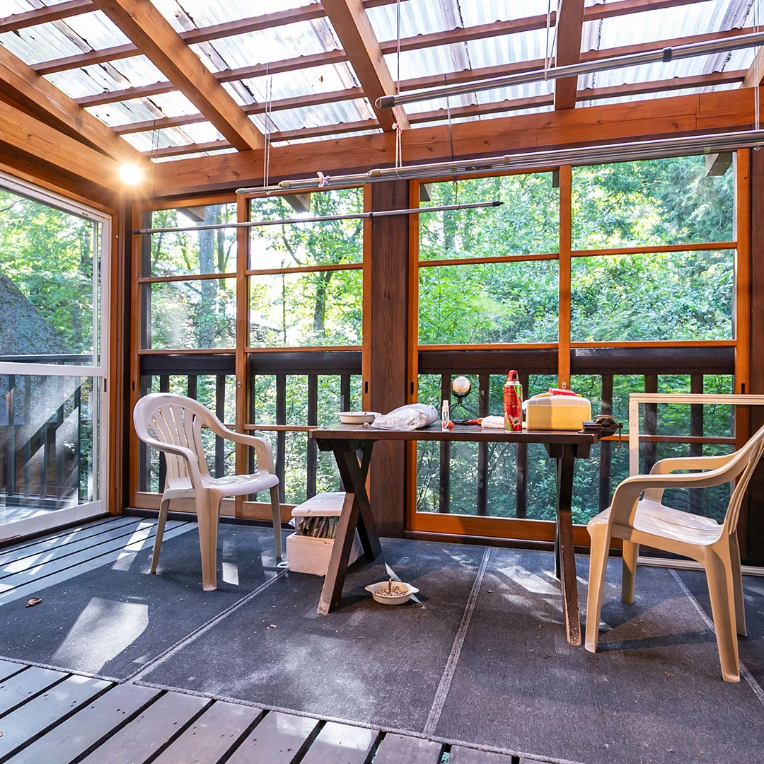 リビングの外には、四方を囲ったウッドデッキがあり、サンルームとしても利用可能。