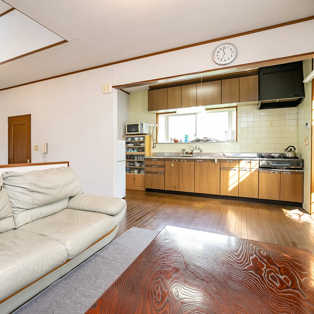 建物は延床約70㎡の2LDK。ゆったりとした18.6帖のLDKは、大きな窓から心地よい光が差し込み、海を望む開放的な空間となっています。