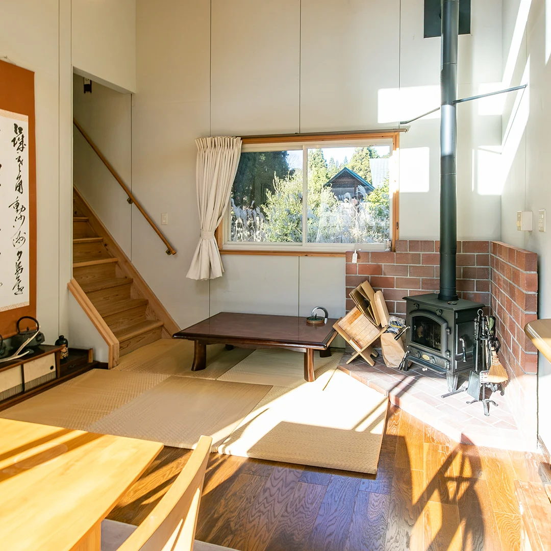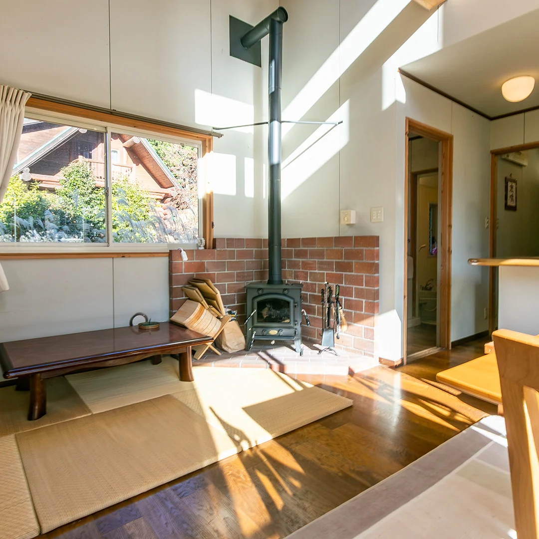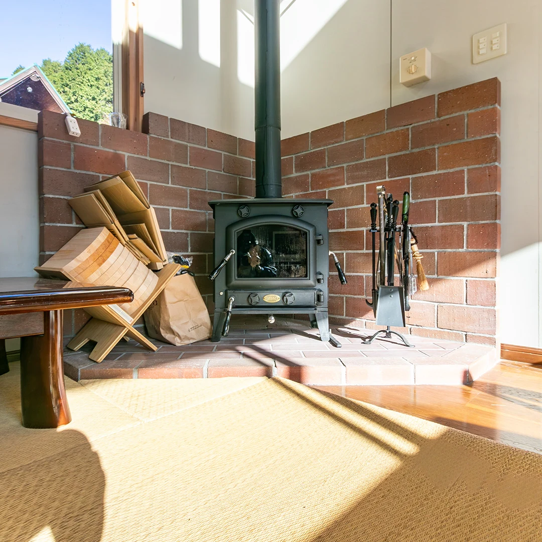 薪ストーブが設置され、冬には炎の揺らぎを楽しみながら心まで温まる時間を過ごせます。