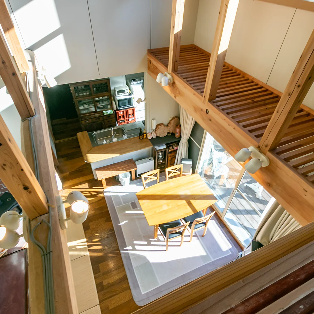 室内は延床66㎡の2階建て2LDK。13.6帖のLDKは吹抜があり、実際以上の広がりを感じられる開放的な空間です。