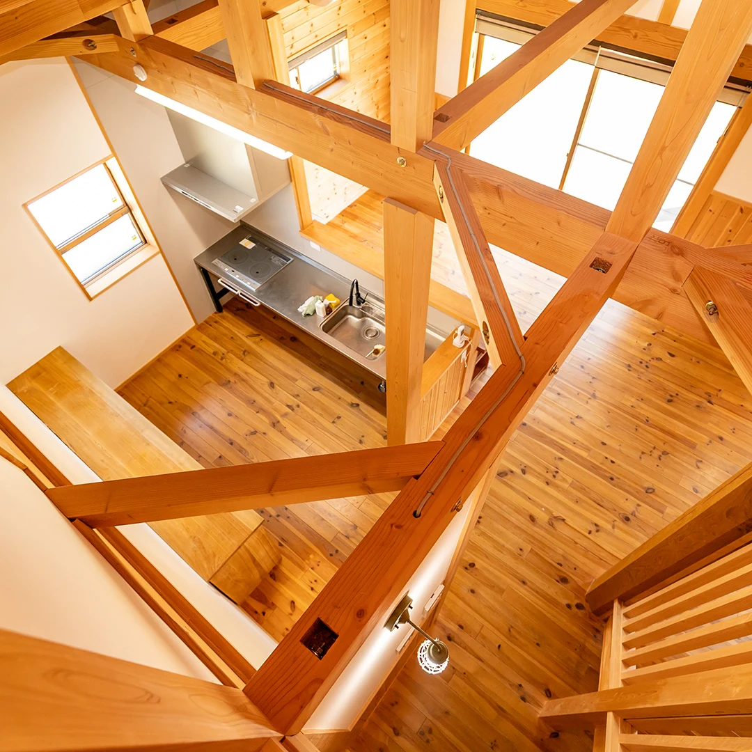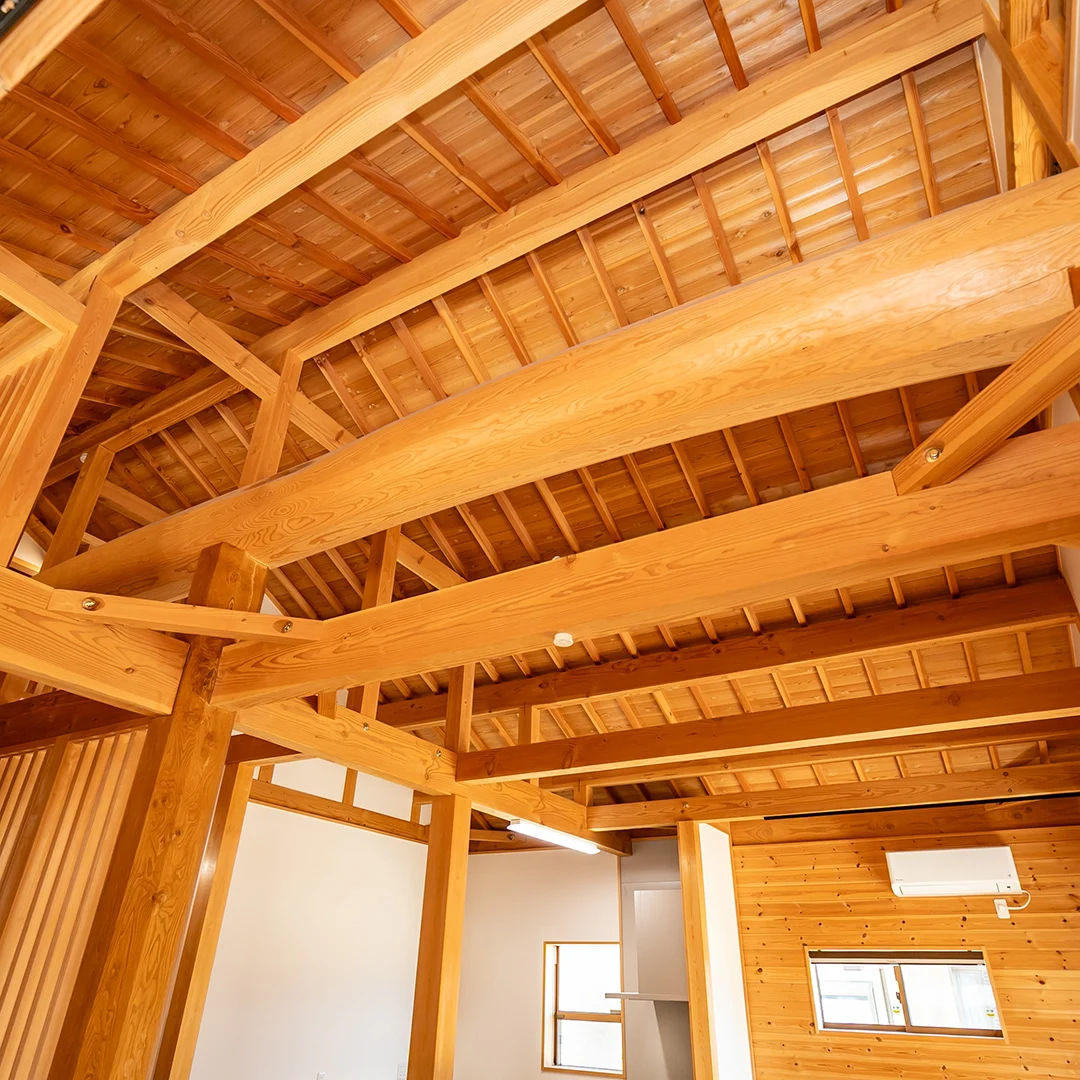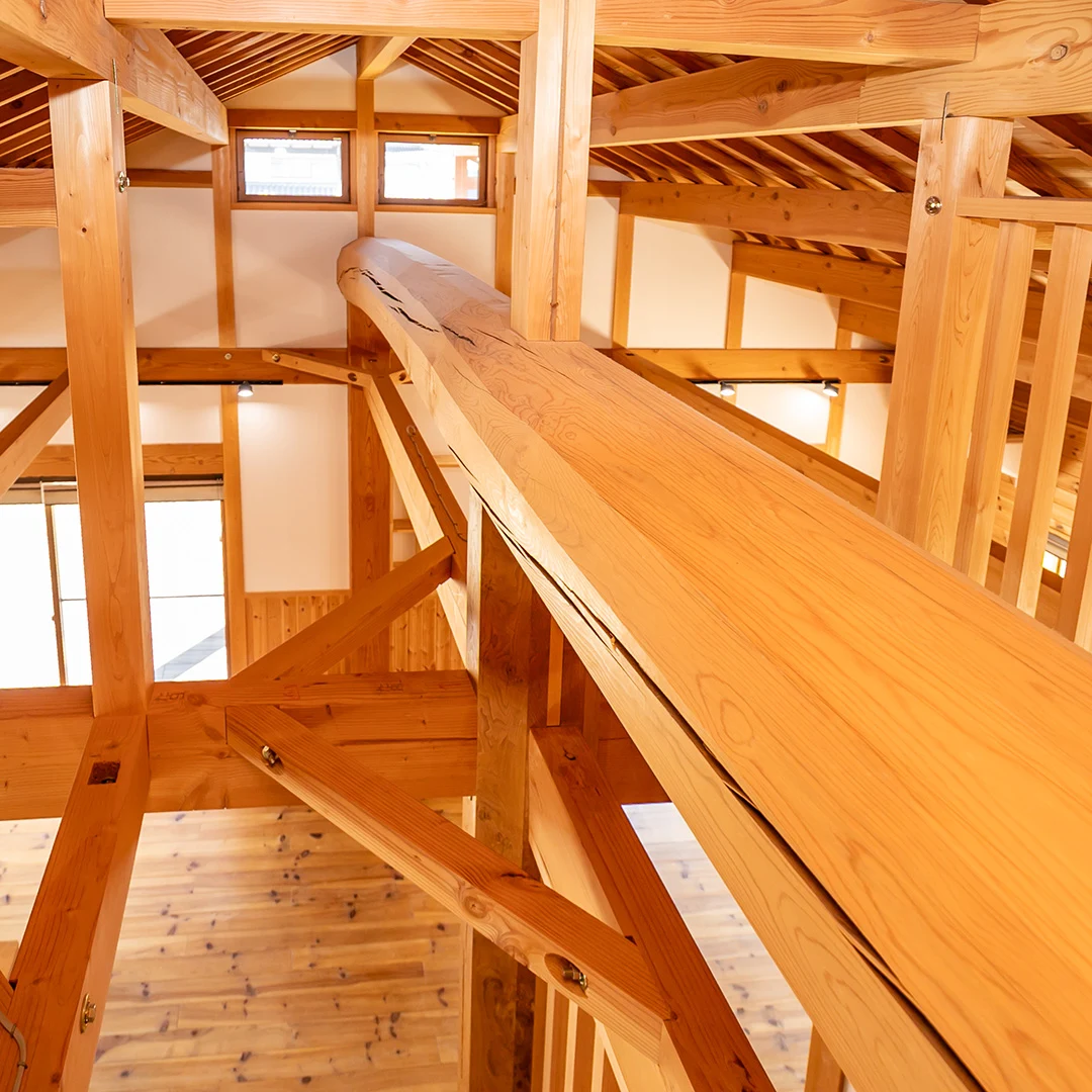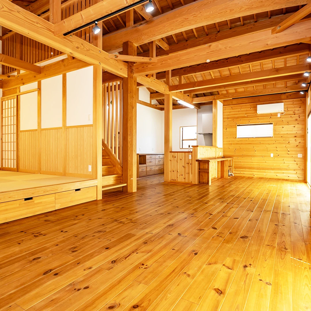 中でもリビングの天井部にどっしりと据えられた極太の松の梁は、住まいに重厚感と風格を与える象徴的な存在です。