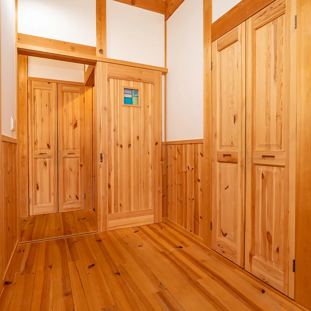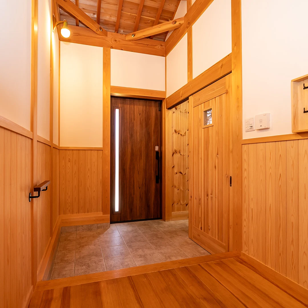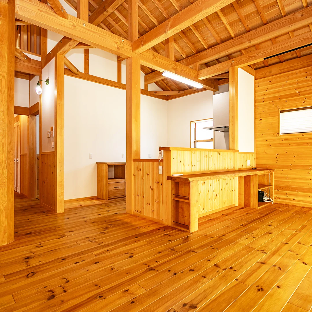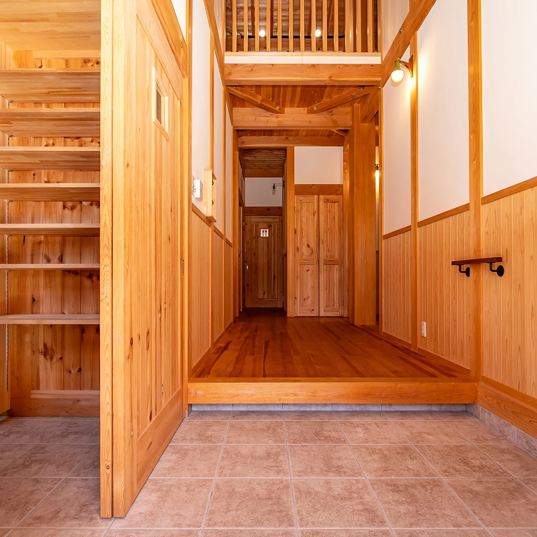 大喜工務店施工による上質な一邸で、栗・欅・檜・松といった厳選された無垢材をふんだんに使用し、室内に一歩足を踏み入れると、木の香りと温もりに包まれる心地よい空間が広がります。