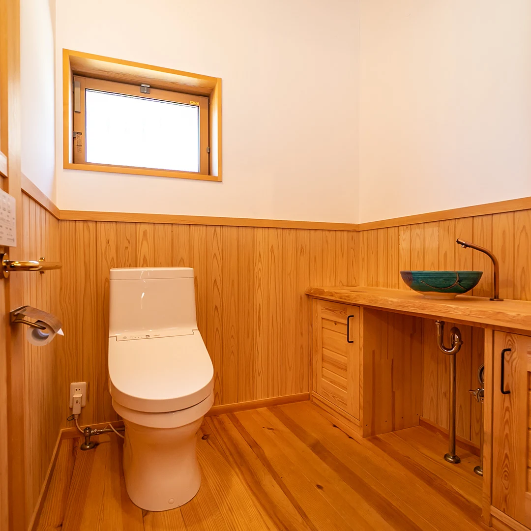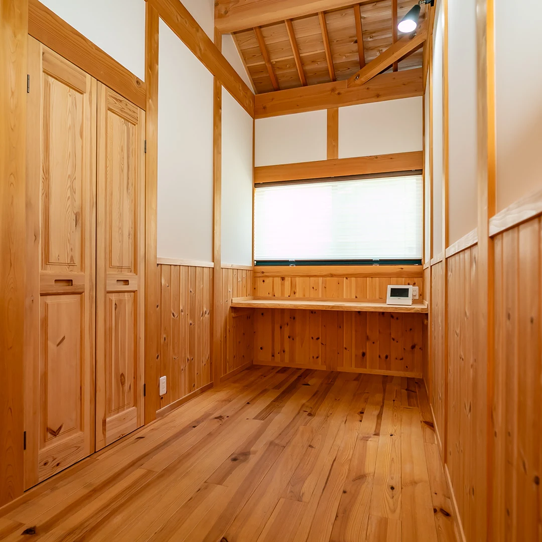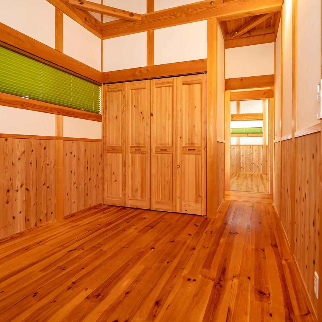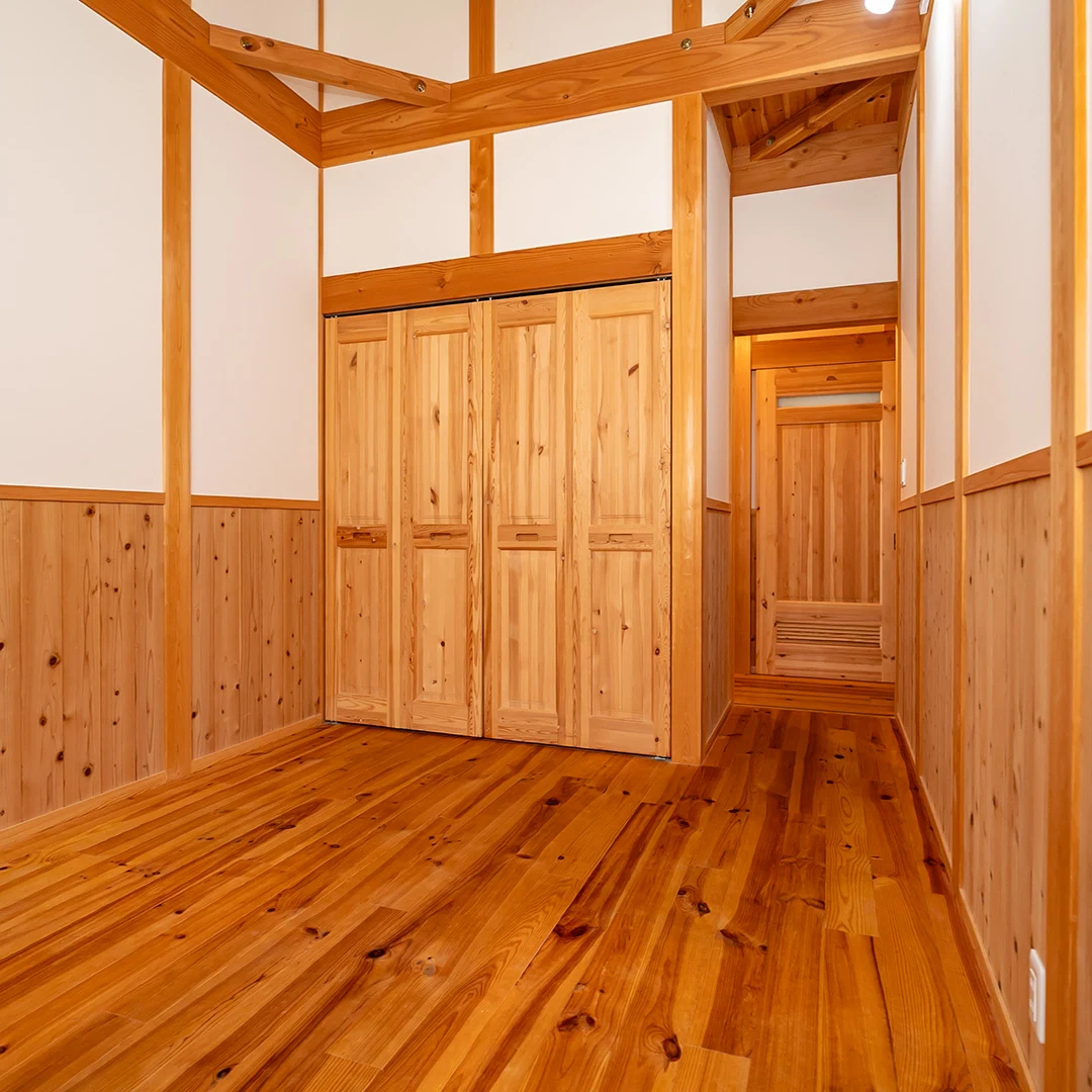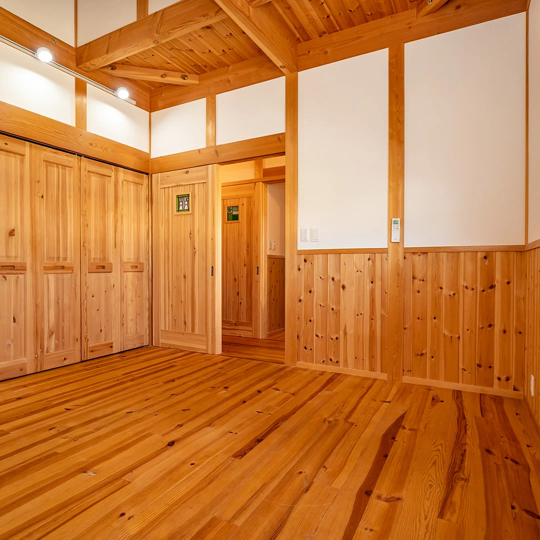 大喜工務店施工による上質な一邸で、栗・欅・檜・松といった厳選された無垢材をふんだんに使用し、室内に一歩足を踏み入れると、木の香りと温もりに包まれる心地よい空間が広がります。