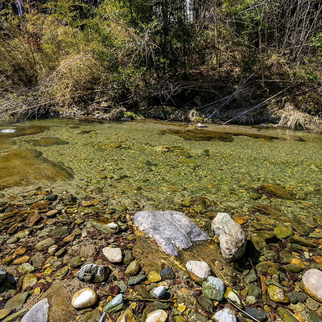 流れは穏やかで透明度が高く、四季折々の自然を映し出す美しい清流。